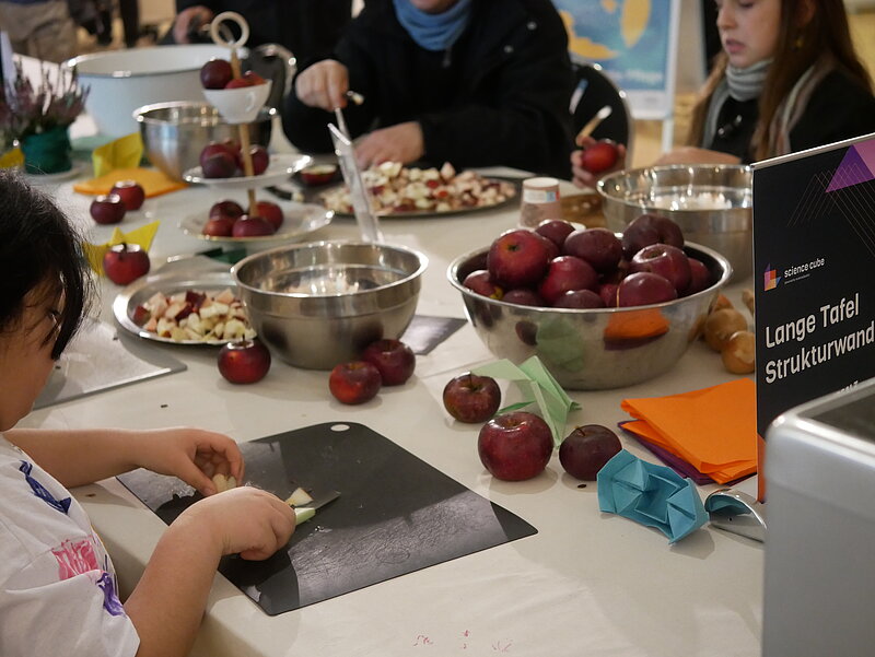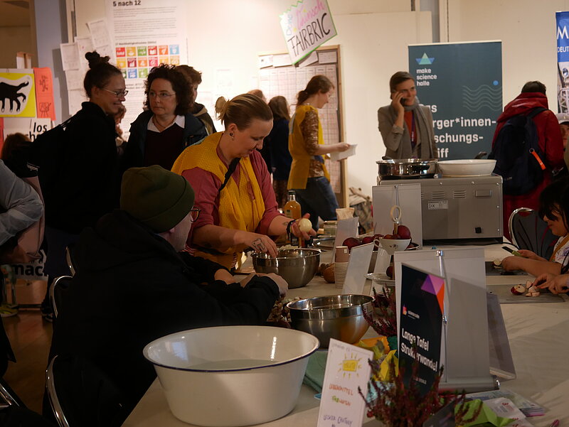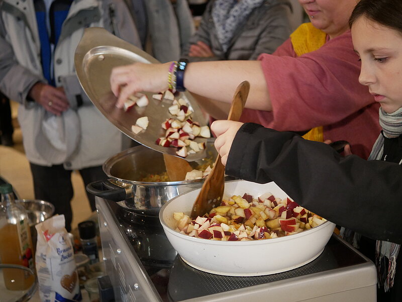 Zum Abschluss wurde es gemeinschaftlich und duftend: Unter dem Motto „Lebensmittel wiederFAIRwenden“ lud der losmachen e.V. dazu ein, beim gemeinsamen Schnippeln, Rühren und Würzen mitzumachen. Zusammen mit den Besucher*innen entstand ein würziges Apfelchutney mit Kokosfett, Ingwer, Chili, Kardamom, Apfelessig, Zucker und weiteren feinen Gewürzen.