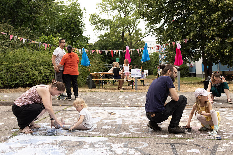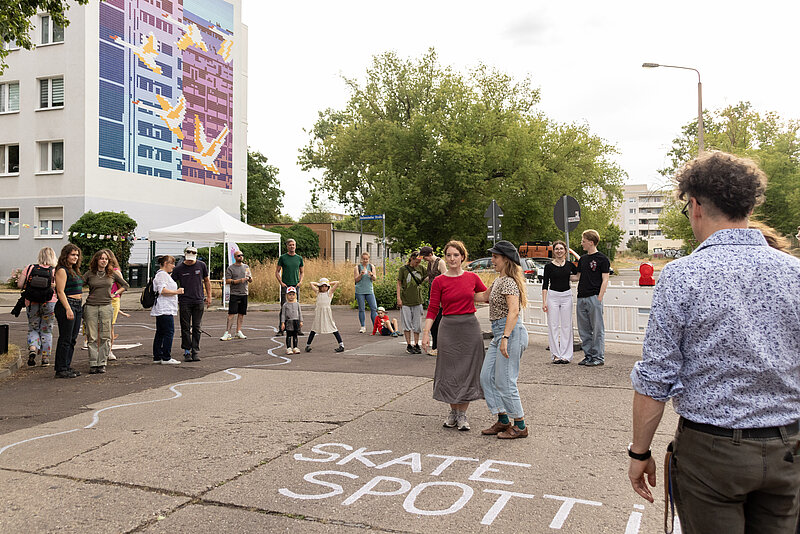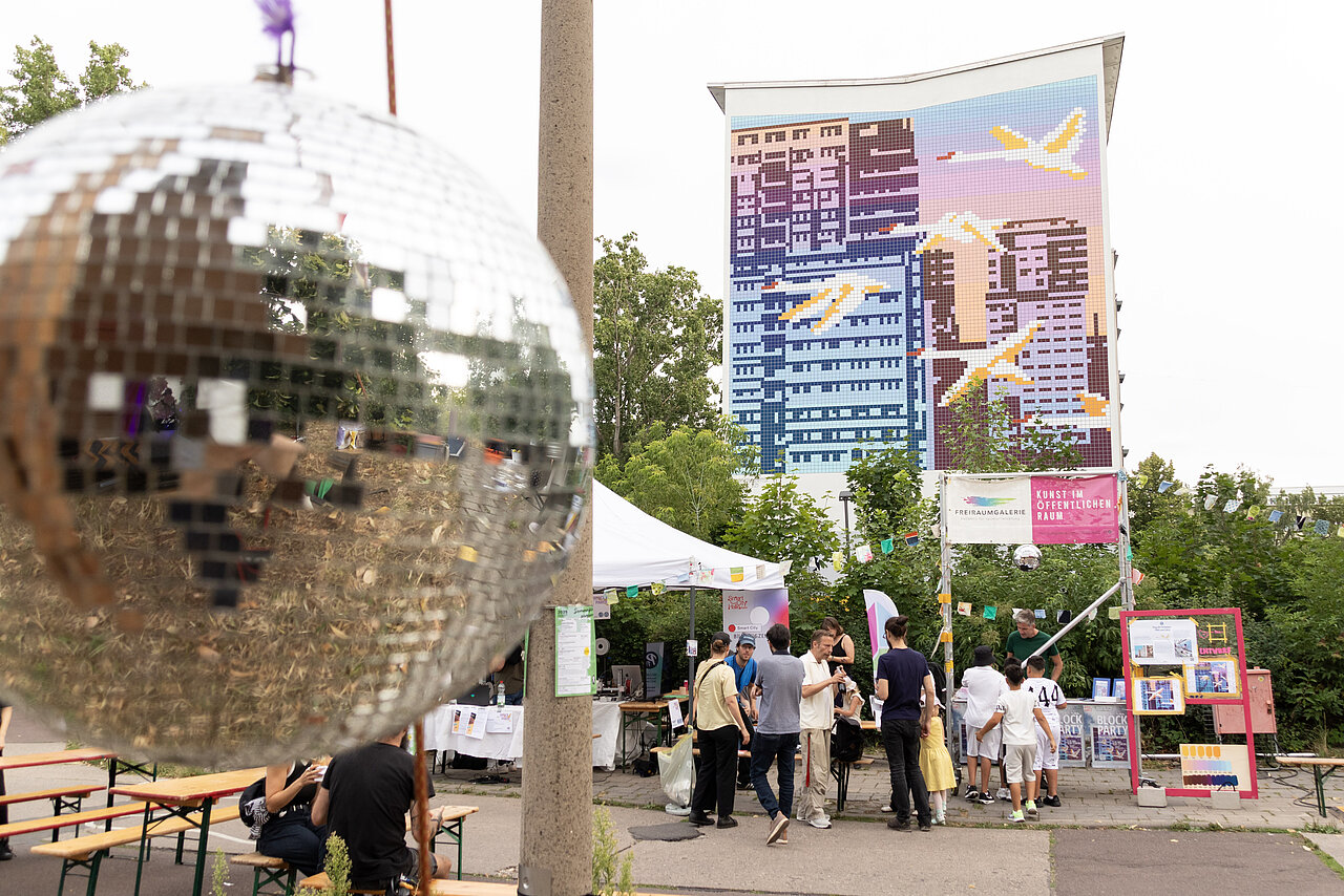 Den Auftakt bildete die feierliche Einweihung des neuen Wandbilds „Flug der Schwäne“ an der Meisdorfer Straße. Das Kunstwerk aus rund 10.000 farbigen Quadraten wurde von Danilo Halle und Hanna Müller-Kaempffer gestaltet und interpretiert das Original von Heinz Möhrdel aus dem Jahr 1984 neu. Eine Führung mit dem Architekten und Fotografen Martin Maleschka gab Einblicke in die Geschichte der Kunst am Bau in der DDR.
